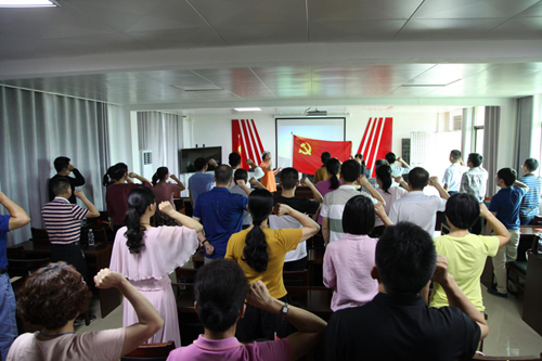 接着,市委党校副校长杨斌同志带领在场的全体党员重温了入党誓词。同志们高举右手,面对鲜红的党旗庄严宣誓,再次激发了自身的党员身份意识,坚定了内心的理想信念。