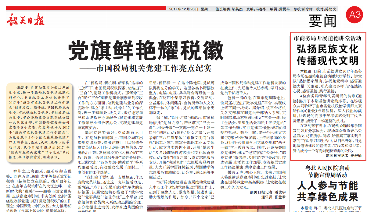 日前,市道德讲堂2017年商务局专场在韶关电视台演播大厅举行。讲堂以“品读墨家经典,弘扬兼爱精神,感悟道德力量”为主题,形式生动多样,旨在洗涤心灵,感悟道德,践行道德。