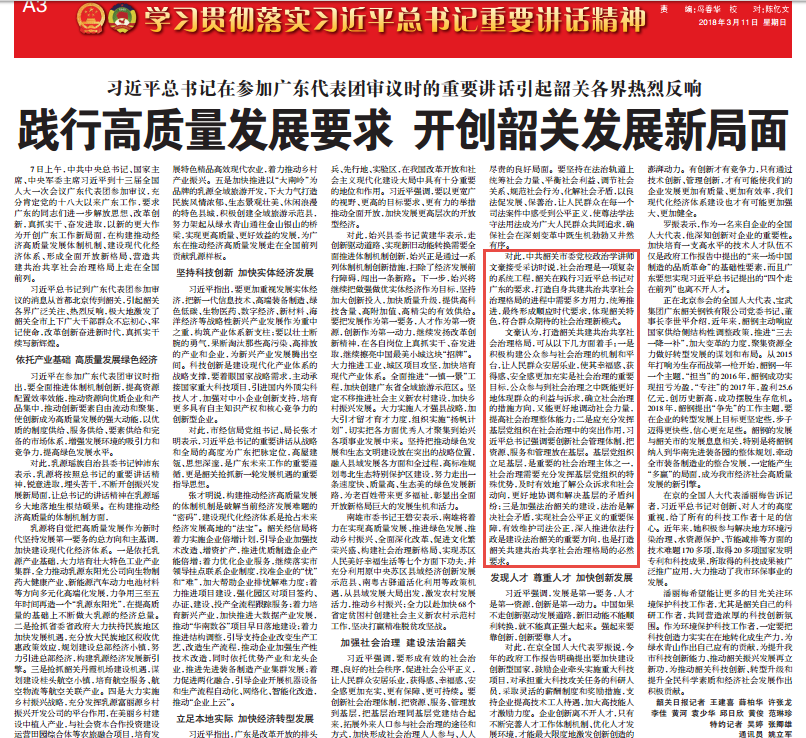 习近平总书记到广东代表团参加审议的消息从首都北京传到韶关,引起韶关各界广泛关注、热烈反响,极大地激发了韶关全市上下广大干部群众不忘初心、牢记使命,改革创新奋进新时代,真抓实干续写新辉煌。