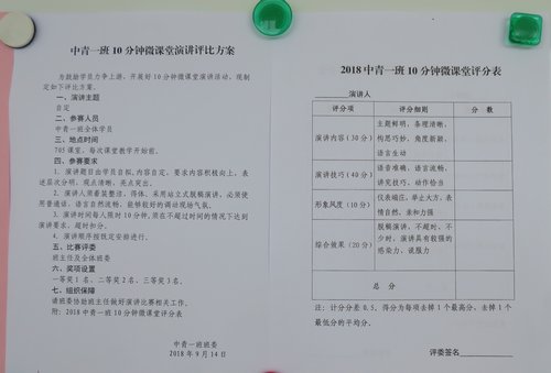 中青一班还对本次的微课堂演讲进行评比,制定了相应的评选方案,分别从演讲内容、演讲技巧、形象风度和综合效果四个方面对微课堂演讲进行打分。通过评比充分激发了学员的积极性,让微课堂演讲的质量更高,内容更加丰富多样。