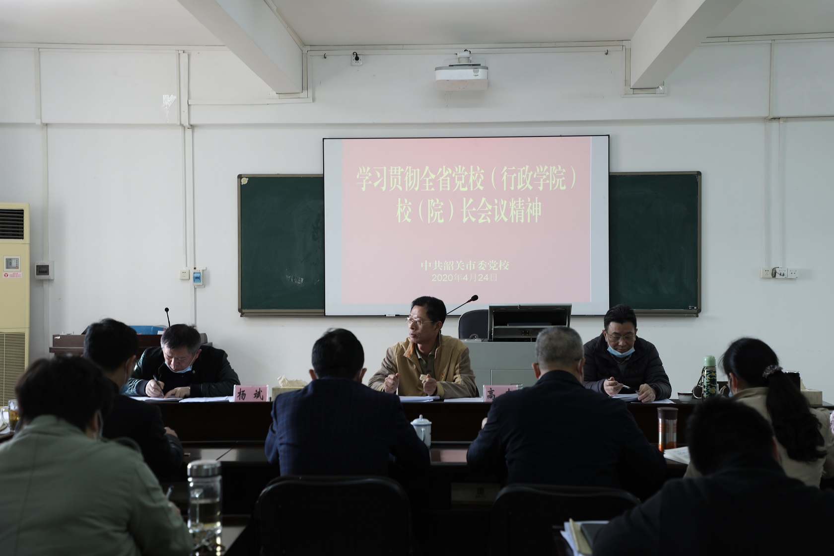 4月24日下午,韶关市委党校召开校务扩大会议,专题学习贯彻全省党校(行政学院)校(院)长会议精神。常务副校长高忠同志主持会议,校领导班子和中层副职以上干部参加会议。