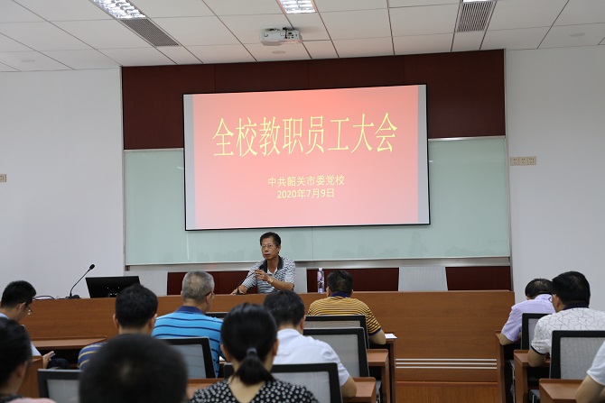 2020年7月9日,市委党校在韶关红色教育基地(新校区)丹霞楼304课室召开全校教职工大会。校委会班子成员及全校教职工参加会议。