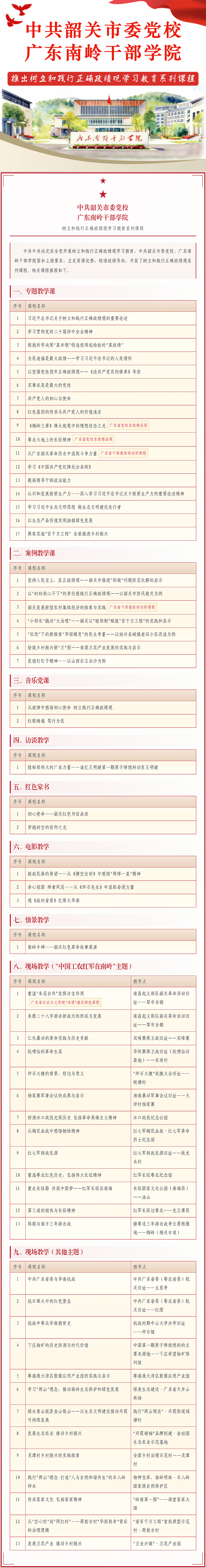 近日,中共韶关市委党校、广东南岭干部学院正式推出“树立和践行正确政绩观”与“党的二十届四中全会精神”重点专题课程清单,旨在发挥红色教育资源优势,聚焦“中国工农红军在南岭”主题,为各级各地各单位提供高质量、专业化党性教育培训服务。