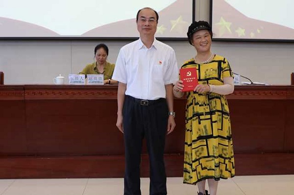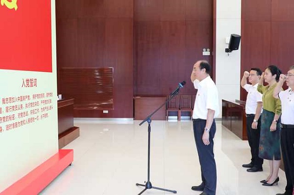颁奖完毕后,与会党员在雷能福同志的领誓下,面向党旗,举起右拳,重温入党誓词。