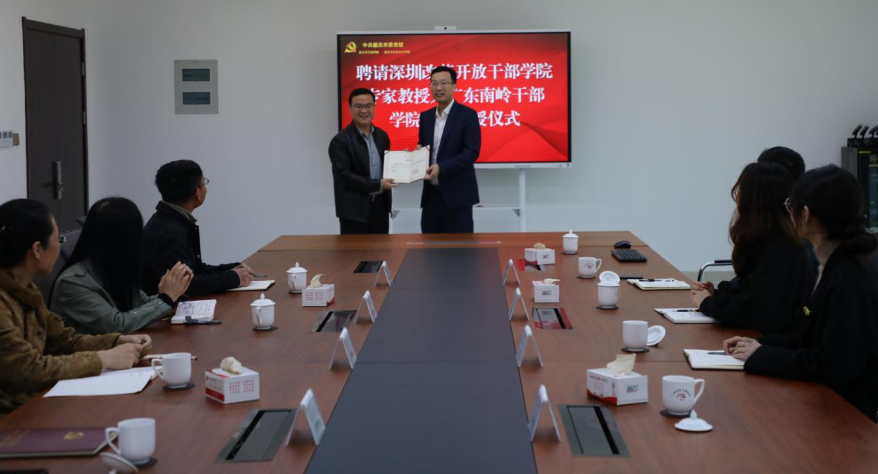 最后,为增强改革开放教学的师资力量,校院特聘宫正为广东南岭干部学院客座教授,并举行了聘书颁发仪式。后续校院将依托深圳改革开放干部学院特色资源及师资力量,不断拓展改革开放课程体系。