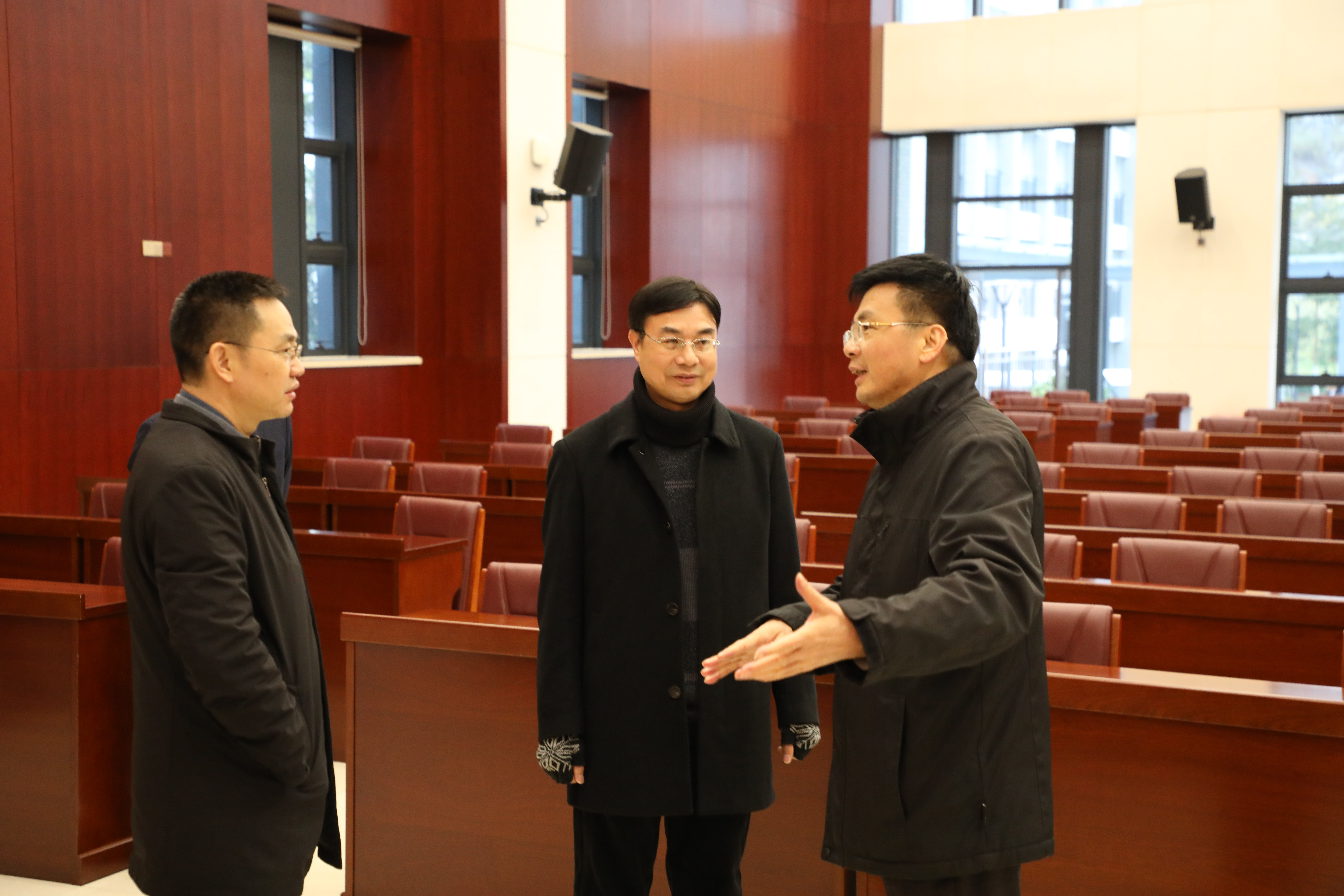 丁有波(右一)一行实地参观学校教学楼。