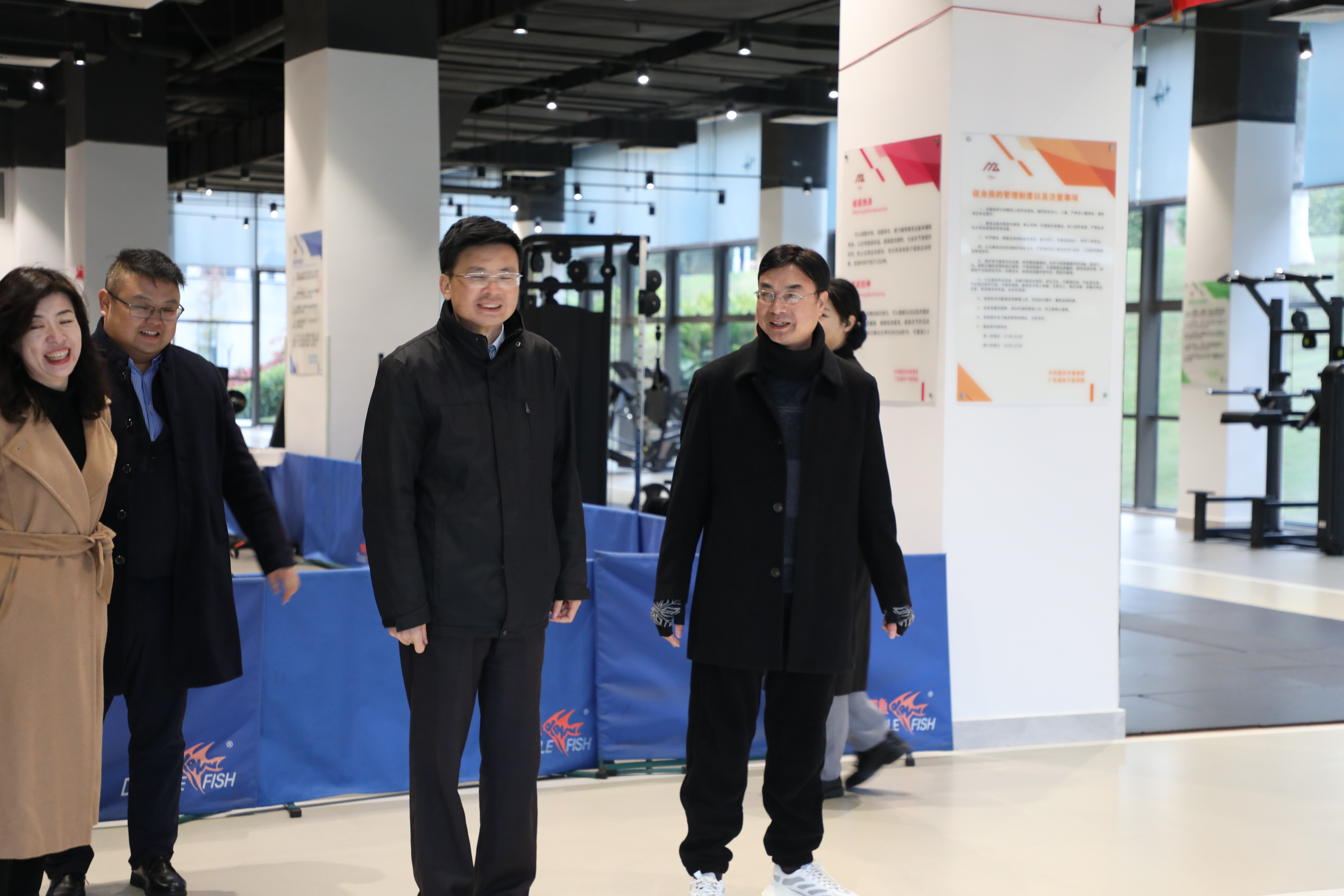 丁有波(中)一行实地参观学校文体中心。