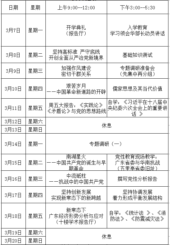 2016年第一期正职班教学日程表